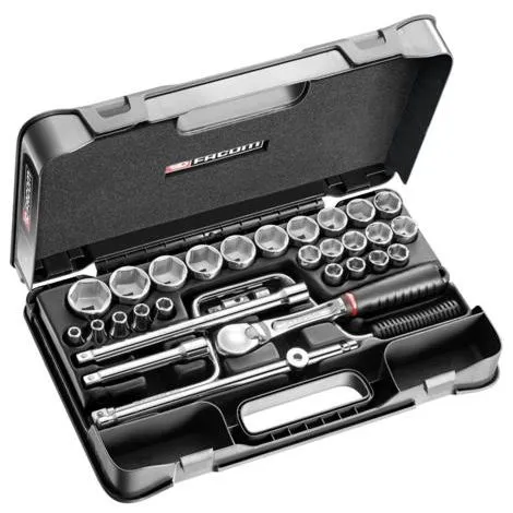 - 24 x douilles 1/2 6 pans métriques : S.H 8 – 9 – 10 – 11 – 12 – 13 – 14 – 15 – 16 – 17 – 18 – 19 – 20 – 21 – 22 – 23 – 24 – 26 – 27 – 28 – 29 – 30 – 32 – 34 mm.