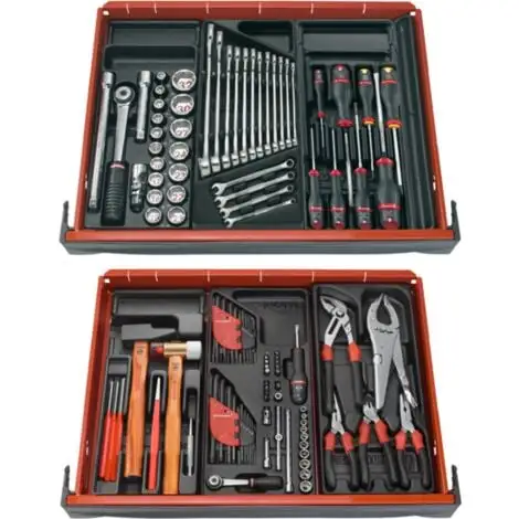 - Composition cliquet douilles 1/4 avec douilles de 5,5 à 14 mm, rallonges, cardan, poignée, tournevis, jeu de 9 clés 6 pans de 1,5 à 8 mm, jeu de 8 clés torx de 10 à 45, jeu d’embouts plats, Phillips Pozidriv Résistorx